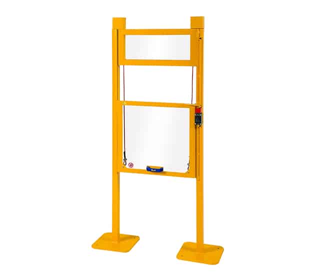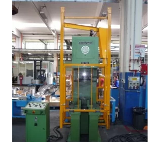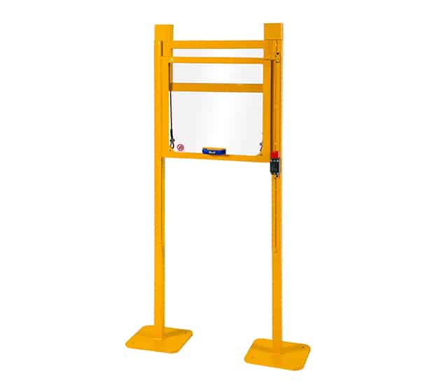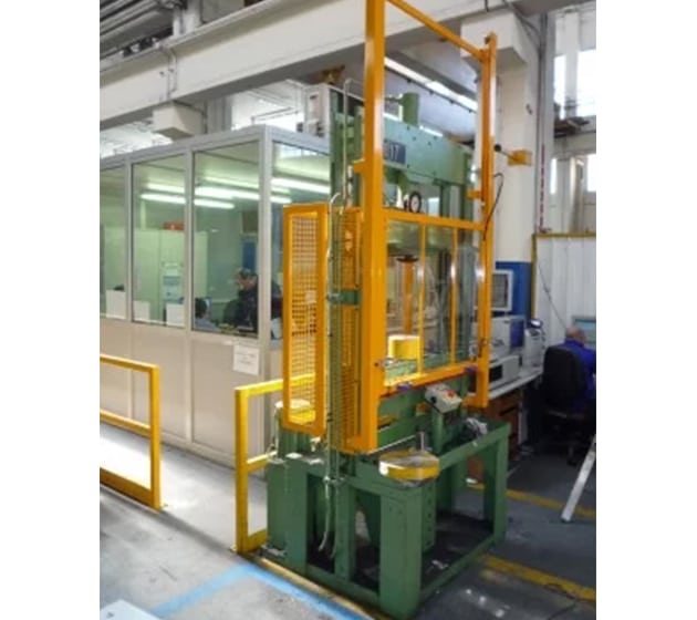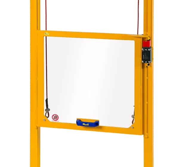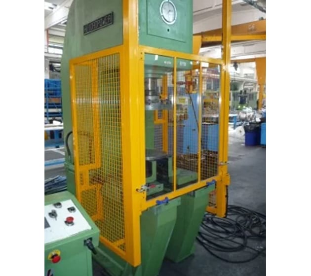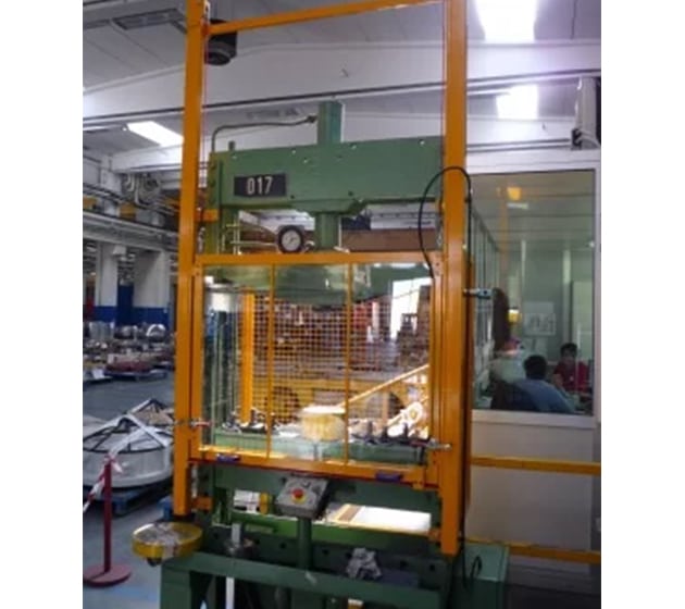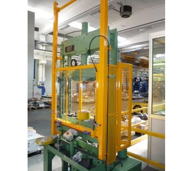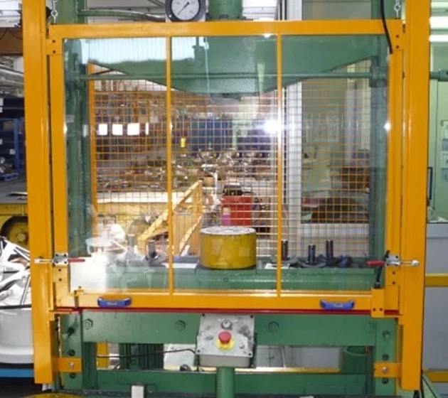 Integrerat, vertikalt glidande säkerhetsskydd för hydraulpressen. Tillverkad av rörformade skärmar och polykarbonatskärmar. Sidopaneler är skjutbara och kan placeras på plats. Komplett med mikrofon som stoppar maskinen när skyddet är öppet. Markfäste