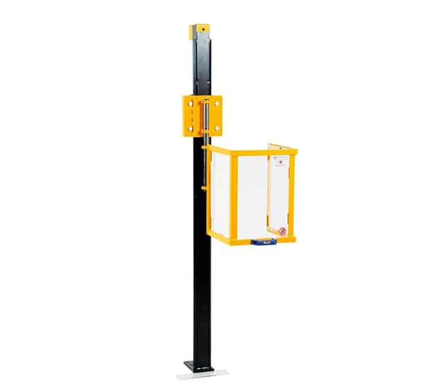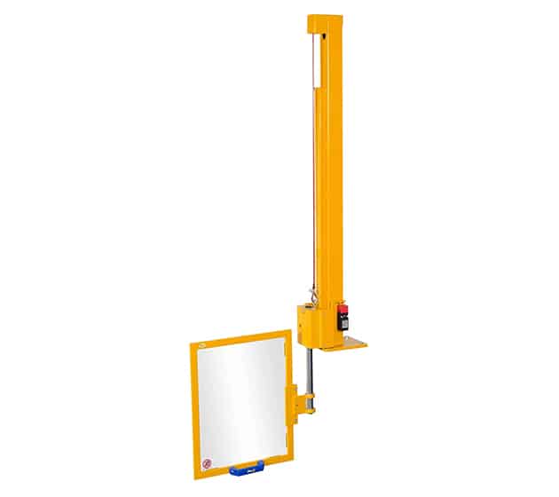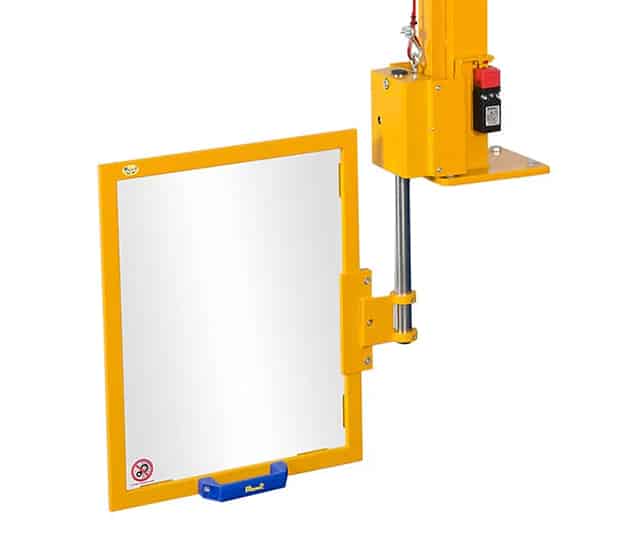 Säkerhetsskydd för operatörsområde; vertikal rörelse med glidande motvikt på stålkullager. Säkerhetsmikrobrytare låser maskinen när skyddet är uppfällt. Standardstorlekar finns redan tillgängliga. Sockelns höjd anpassas efter skärmstorlek (mått på begäran).