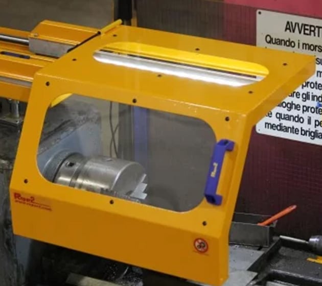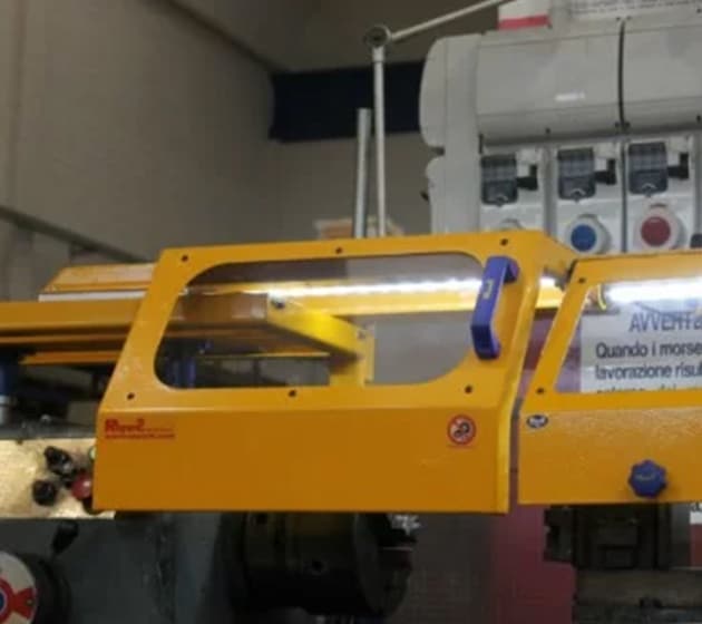 Glidskydd på kulhylsor för montering på svarvhuvudet. Tillverkad av plåt. Stora fönster med polykarbonatskärmar är utskurna i toppen och framsidan för att ge fullständig sikt. Komplett med mikrobrytarsystem och LED-lampa 24V (LLS-system) – AC/DC IP67-40 000 h-ytterrör Akryl-Snabbkontakt med koppling 5 m.