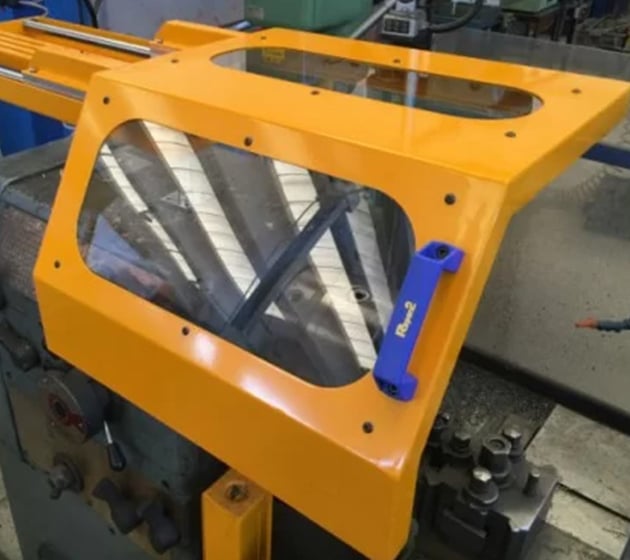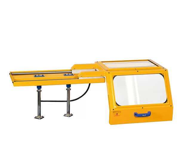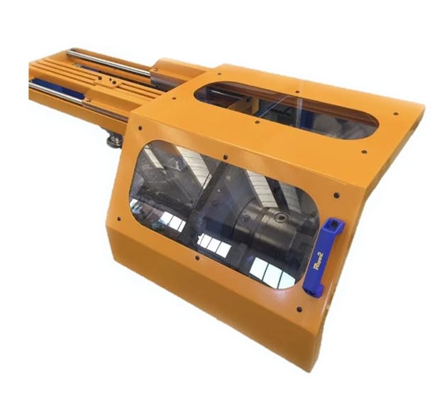 Glidskydd på kulhylsor för montering på svarvhuvud. Tillverkad av plåt. Stora fönster med polykarbonatskärmar är utskurna i toppen och framtill för att ge fullständig sikt. Komplett med mikrobrytarsystem.