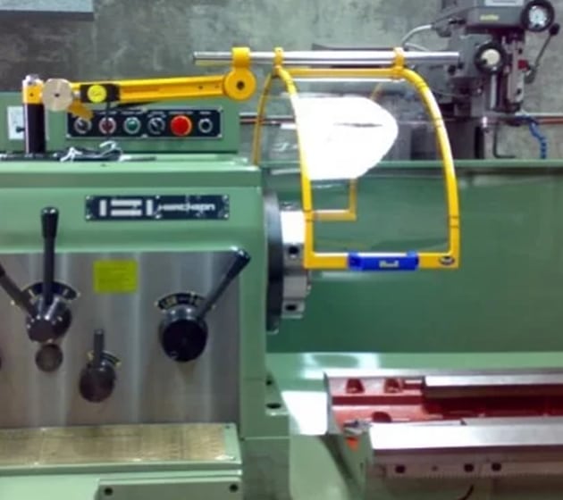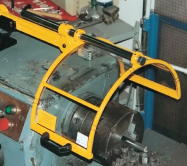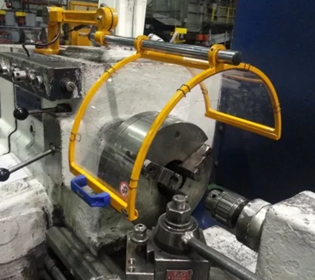 Vertikal svarvskydd med gasfjäder och säkerhetsmikrobrytare, justerbart i höjd och längd.