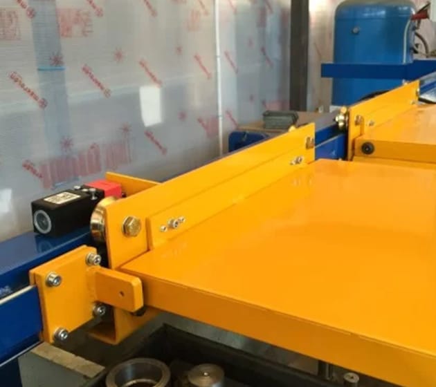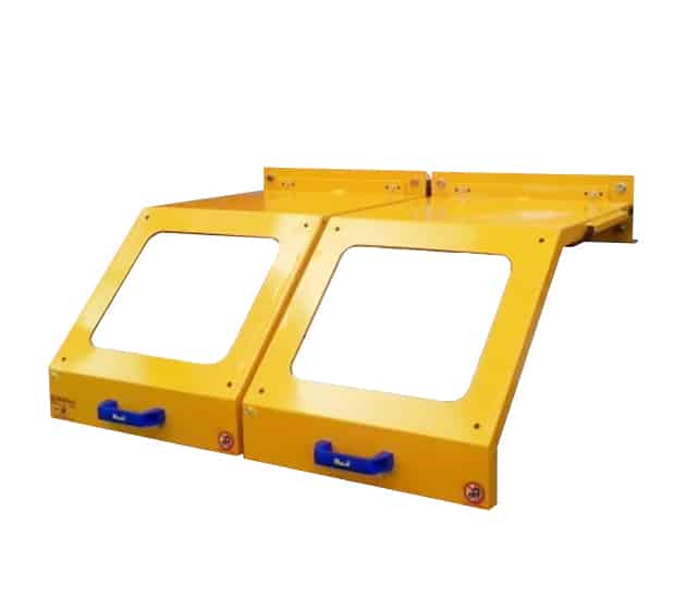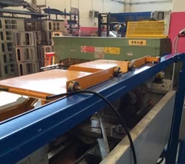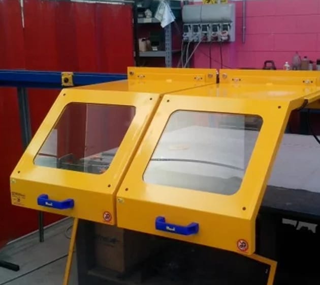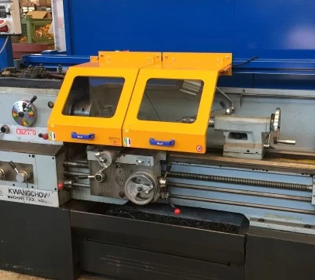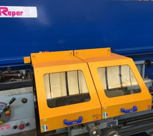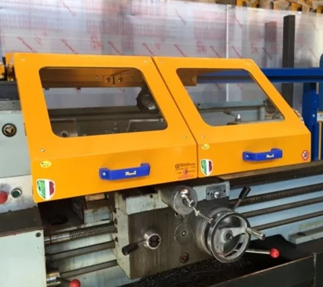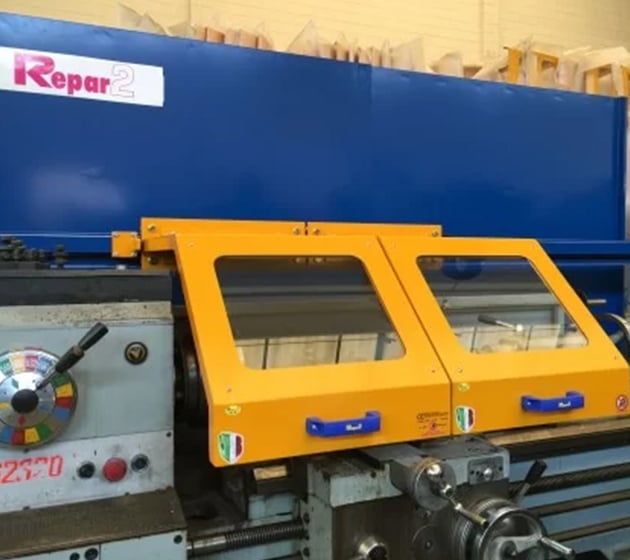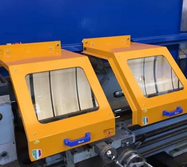 Skydd med dubbelskärm tillverkad av RAL1007 gul stålplåt och laminerat glas, glidande på oberoende skena L-2500 mm, komplett med stöd och fästen. Mikrobrytare på spindelskyddet. LED-lampa 24V-DC på vagnskyddet. Komplett med bakre skydd L.2500mmxH1300 med spånfångare dropp L.400mm i blå RAL5010 stålplåt.