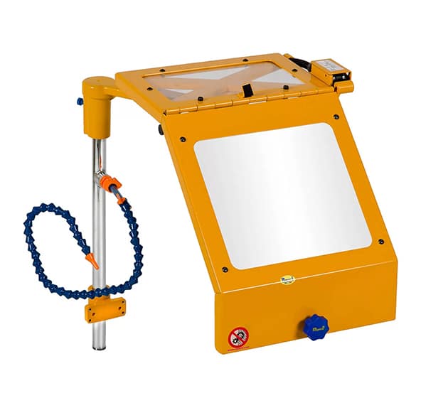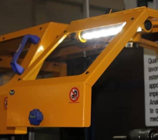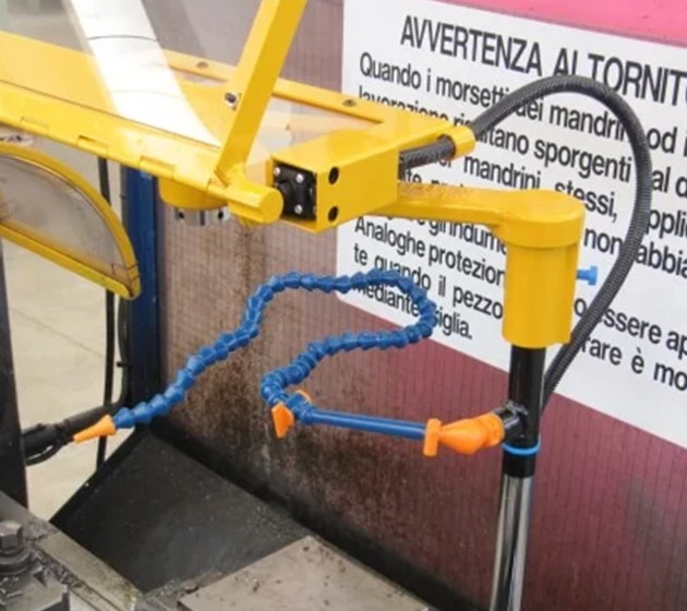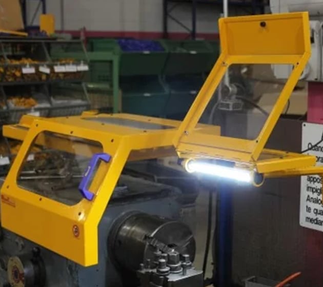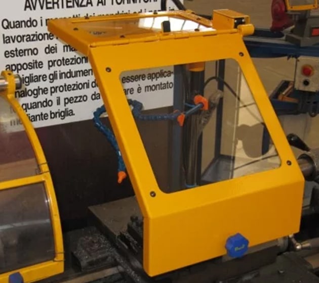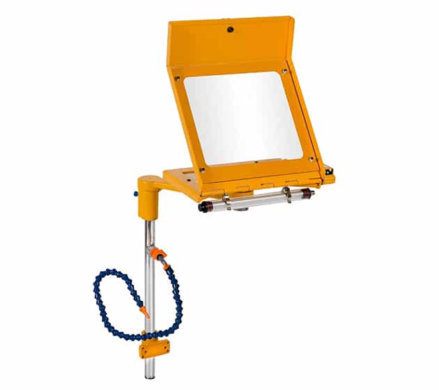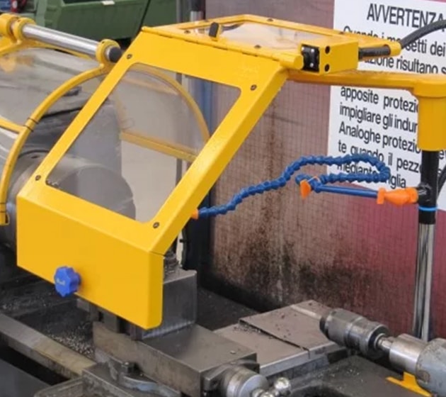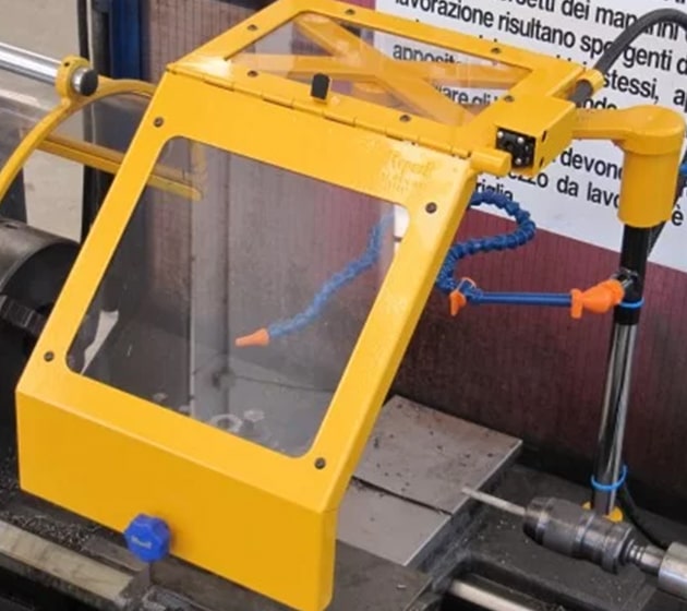Med bakre fäste. Rörligt och vridbart skydd för montering på svarvens längsgående vagn. Stålkonstruktion med polykarbonatskärm, skyddar operatören mot spån och kylvätska. Finns med eller utan kylvätskesystem och mikrobrytarsystem. För montering på baksidan. Möjlighet att montera 24V LED-lampa (LLS-system). AC/DC IP67-40 000 h-ytterrör Akryl-Snabbkontakt med kapsling 5 m.