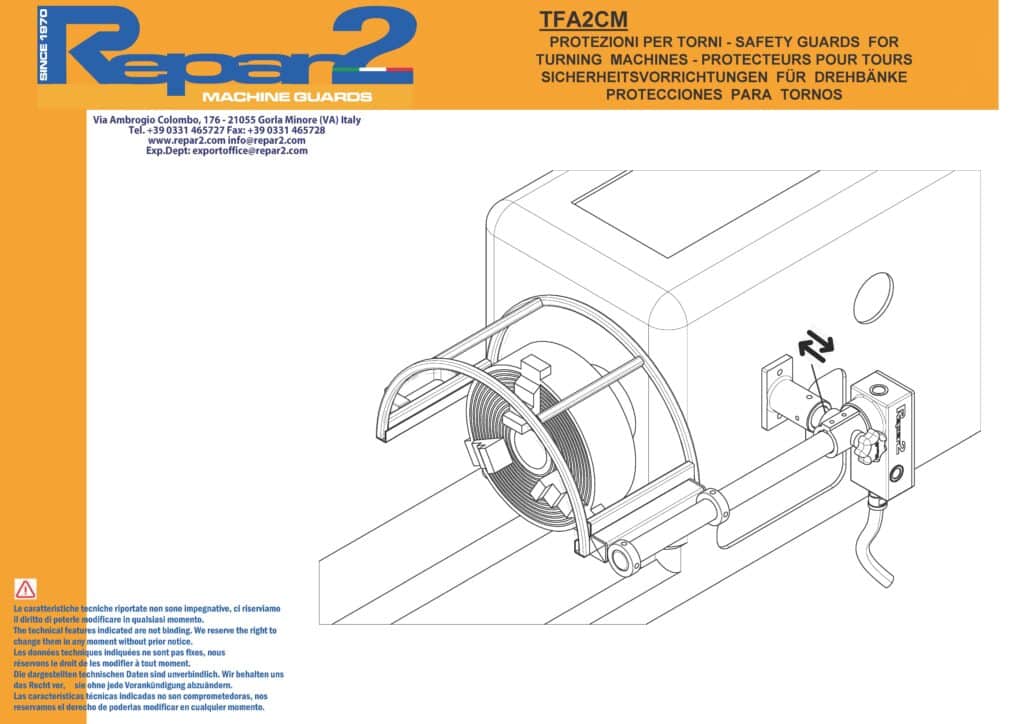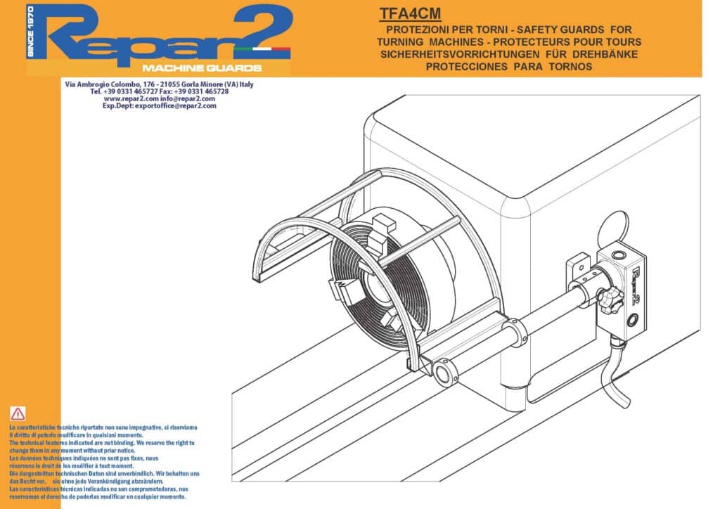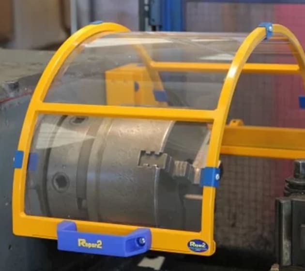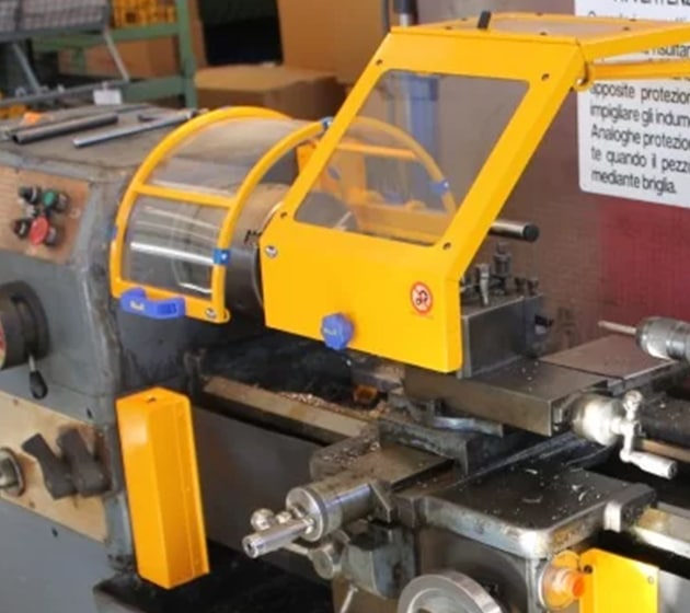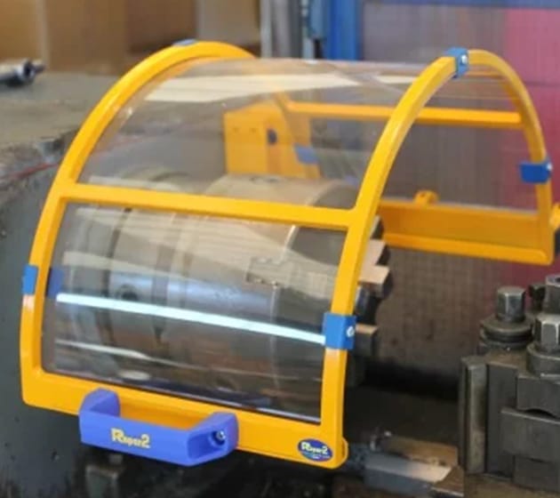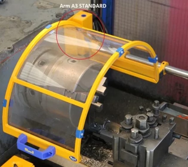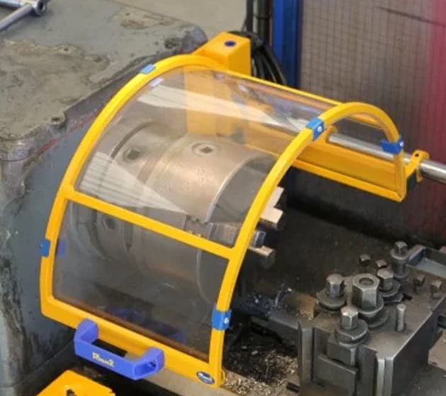 Ram i svarvskärm av polykarbonat och säkerhetsmikrobrytare.